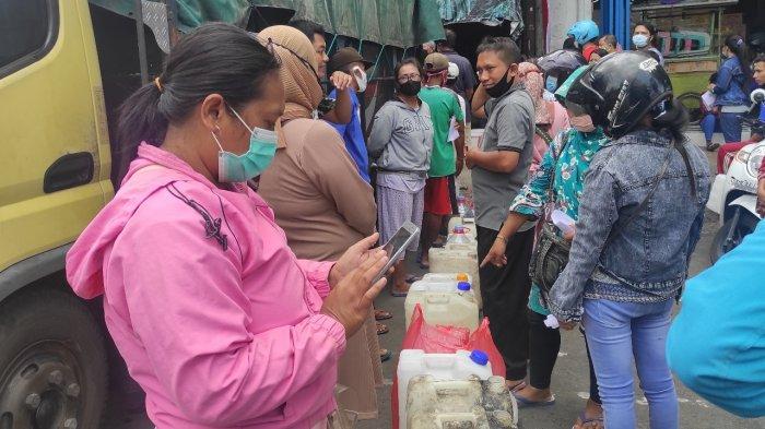 Sejumlah warga terlihat membawa jeriken berdiri di depan Toko Kali Jaya. Bahkan, antrean warga sampai di bahu jalan raya depan toko.