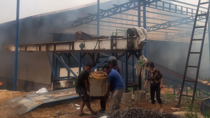 Suara ledakan berkali-kali terdengar saat pabrik pengolahan kayu di Kelurahan Gulomantung, kecamatan Kebomas, kabupaten Gresik, terbakar.