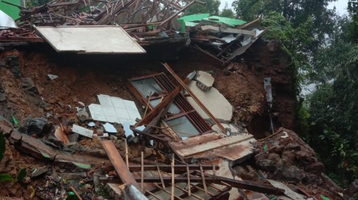 Bangunan yang ambruk rata dengan tanah. Diduga, ambruknya bangunan akibat tanah longsor.