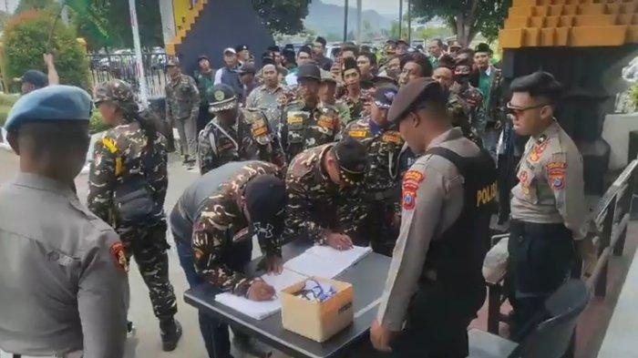 TRIBUNMATARAMAN.COM, TRENGGALEK - GP Ansor dan Banser Tulungagung menggeruduk Mapolres Trenggalek, Jalan Brigjen Soetran, Kecamatan/Kabupaten Trenggalek, Sabtu (18/3/2023).