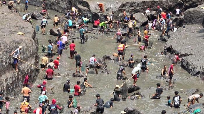 TRIBUNMATARAMAN.COM | BANYUWANGI - Ratusan warga berburu ikan di Dam Singir-Blambangan, Desa Blambangan, Kecamatan Muncar Kabupaten Banyuwangi, Selasa (5/10/2024). Aktivitas itu dilakukan saat proses pengeringan salah satu dam terbesar di Banyuwangi itu.