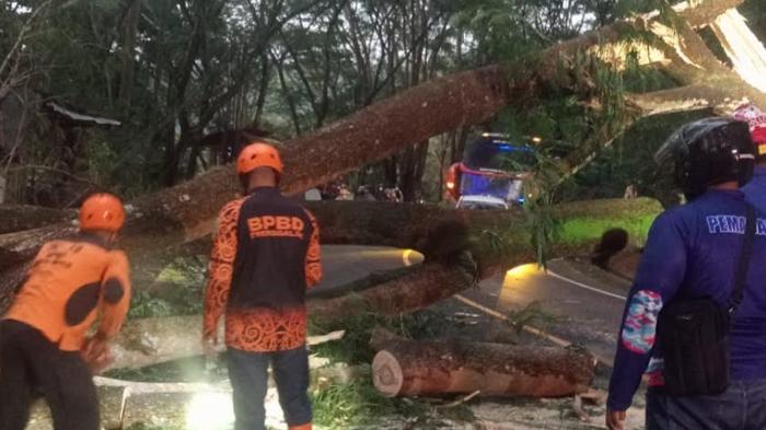 Sebuah pohon tumbang di Jalan Nasional Trenggalek - Ponorogo tepatnya di Desa Nglinggis, Kecamatan Tugu, Kabupaten Trenggalek, Rabu (2/4/2025).